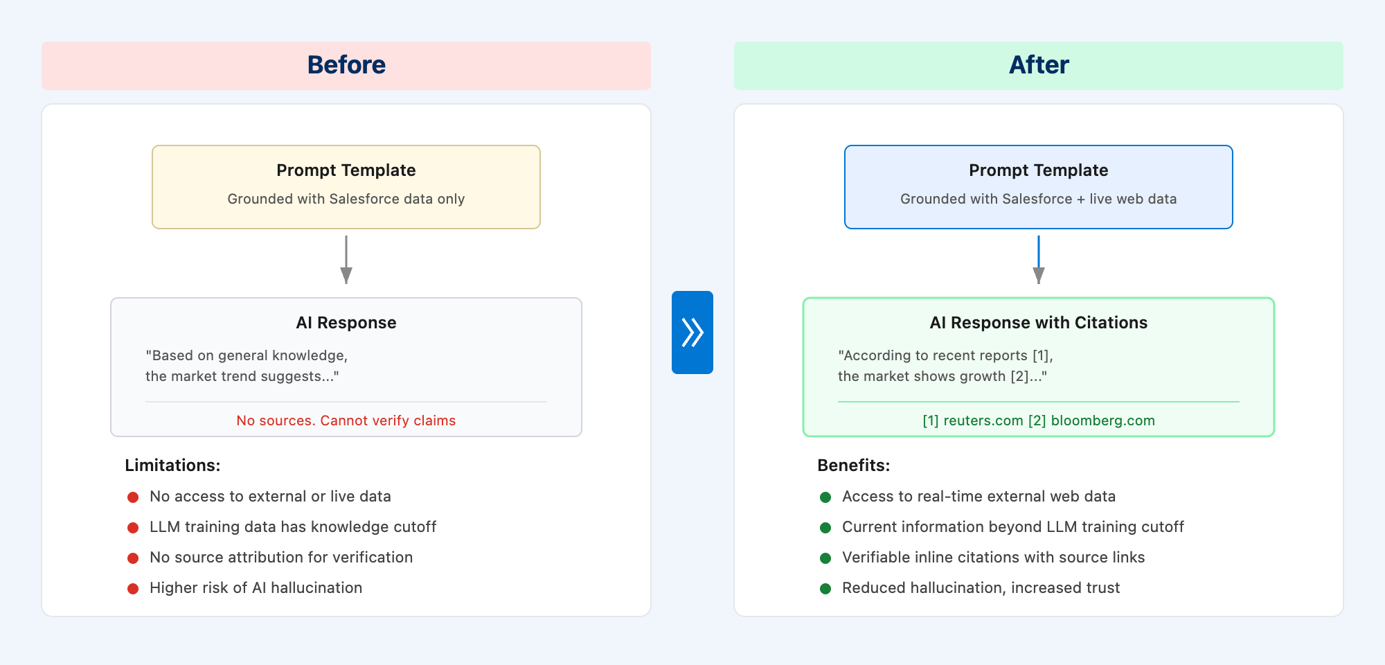 One of the biggest limitations of large language models (LLMs) involves their operation with a fixed training cutoff. If a prompt relies only on the model’s training data, the response may lack the most current or relevant information. Before web retrieval capabilities existed, Prompt Builder grounded prompts using Salesforce data through dynamic placeholders, yet prompts remained limited to internal CRM context.