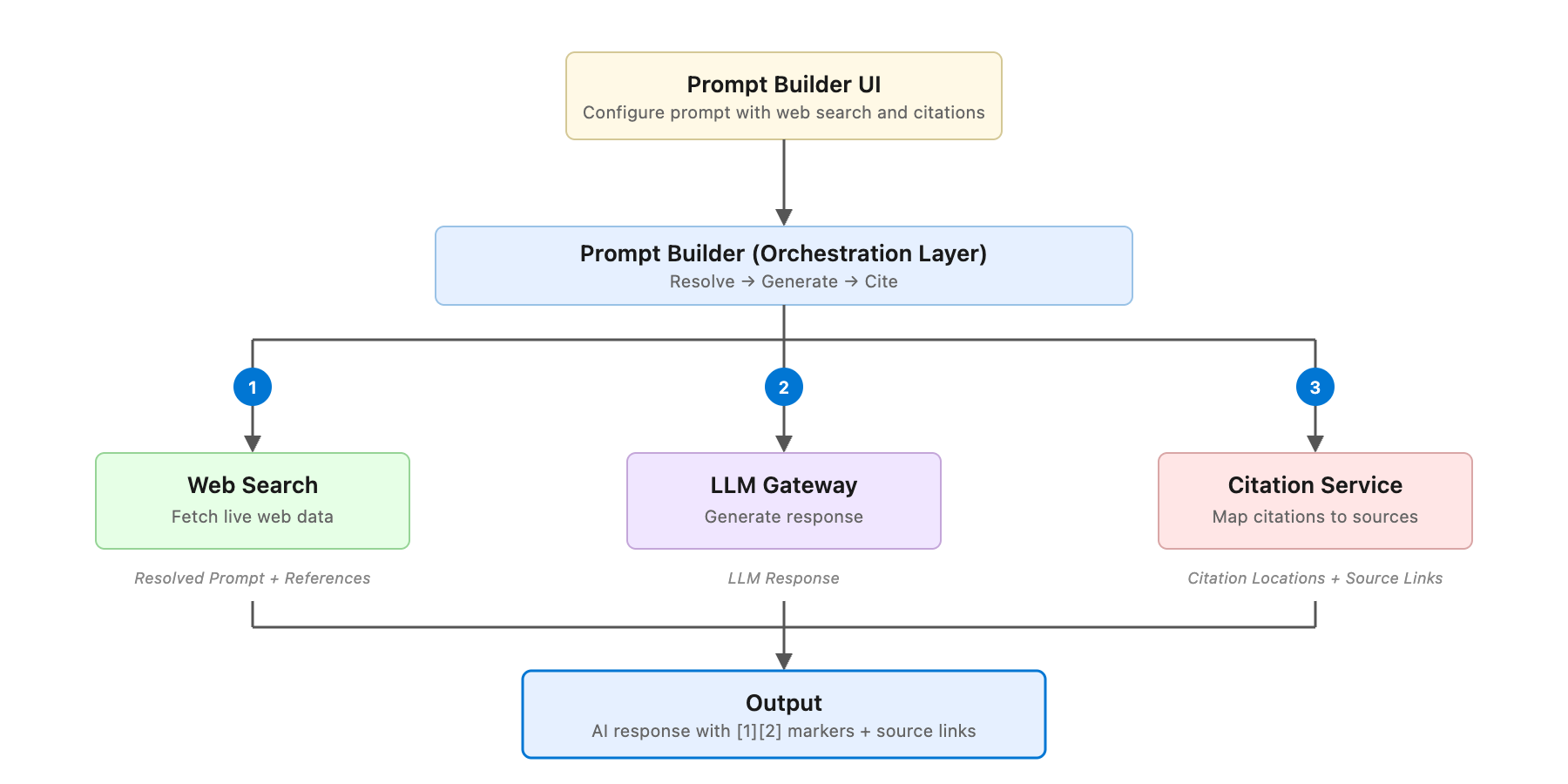To solve this, we designed a citation architecture that links responses to their specific sources. When Prompt Builder resolves prompts using web retrieval, the system collects reference metadata for every piece of information.