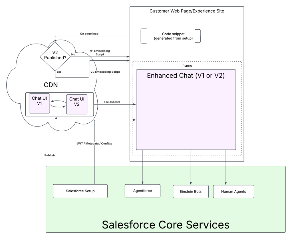 An embedded application isn’t just the component hosted in an iframe; it also necessarily includes some script (however small) hard-coded into the customer’s page, plus an embedding script dynamically loaded into the customer’s page to create and manage the iframe. The script written into the customer’s page can’t change for the upgrade – requiring the customer to update their web page introduces too much friction both for deployment and rollback if necessary. The embedding script is different between v1 and Agentforce Enhanced Chat, it’s important that we avoid version mismatches between the embedding script and the chat UI itself, so version upgrade/downgrade for both has to be managed in a single publish action.