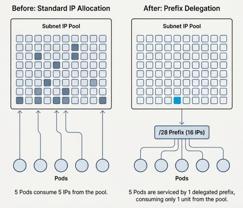 Our big win for getting past AWS’s NAU limit was prefix delegation. But implementing it wasn’t a simple flip of a switch. This method assigns IPs in 16-address blocks, which is tricky to manage in active environments with running services, long-lived pods, and existing allocations. Without careful planning, we could have ended up with fragmentation or less usable capacity.