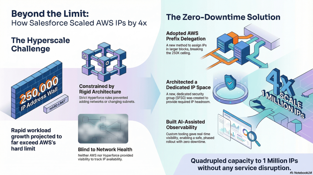 • Hyperforce Architectural Rules: Strict SFSG (Salesforce Security Group)-based IP allocation limits, immutable subnet structures, and no conventional AWS expansion paths meant all scaling occurred within existing Hyperforce constraints.